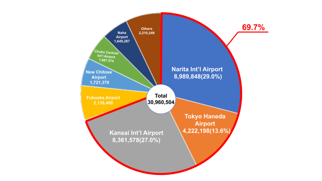 By the airports used by inbound and outbound foreign tourists, the major airports of Tokyo and Osaka account for about 70% of the total. With Kobe Airport offering international services, flying to the Kansai region, housing one of the popular tourists destinations like Kobe, Kyoto and Osaka, will surely become much easier.